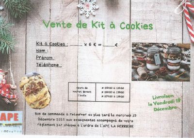 L' Association des Parents d'Eleves (APE) organise une vente de "Kit à Cookies". Dans un bocal joliment décoré, vous trouverez tous les ingrédients nécessaires pour réaliser cette délicieuse gourmandise. Egalement une idée de cadeau originale. Les commandes sont à transmettre au plus tard pour le 15 décembre soit par mail apelaferriere79390@gmail.com ou bon de commande à déposer dans la boîte à lettres de l'école.