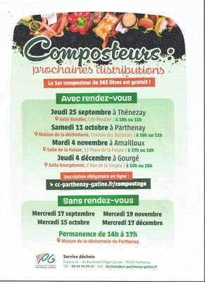 La CCPG organise des journées de distribution de composteurs - avec ou sans rendez-vous (voir affiche). Inscription en ligne obligatoire cc-parthenay-gatine.fr/compostage