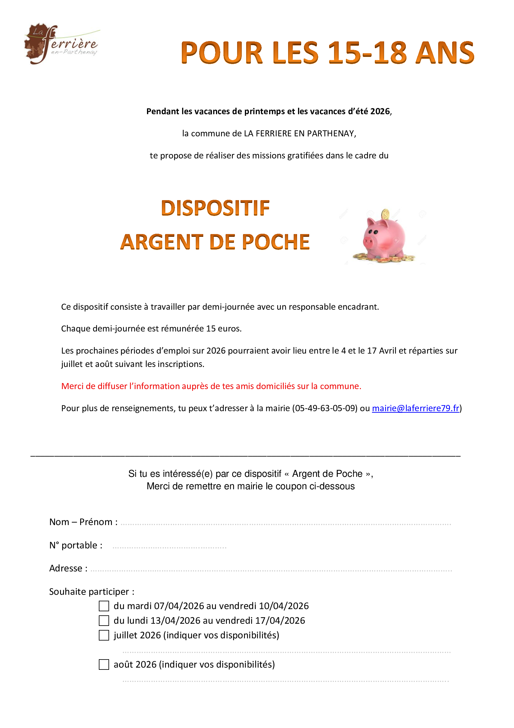 Pendant les vacances de printemps et les vacances d'été, la municipalité renouvelle le dispositif "Argent de Poche" pour les jeunes de 15 à 18 ans. Les inscriptions sont à déposer au secrétariat de mairie.