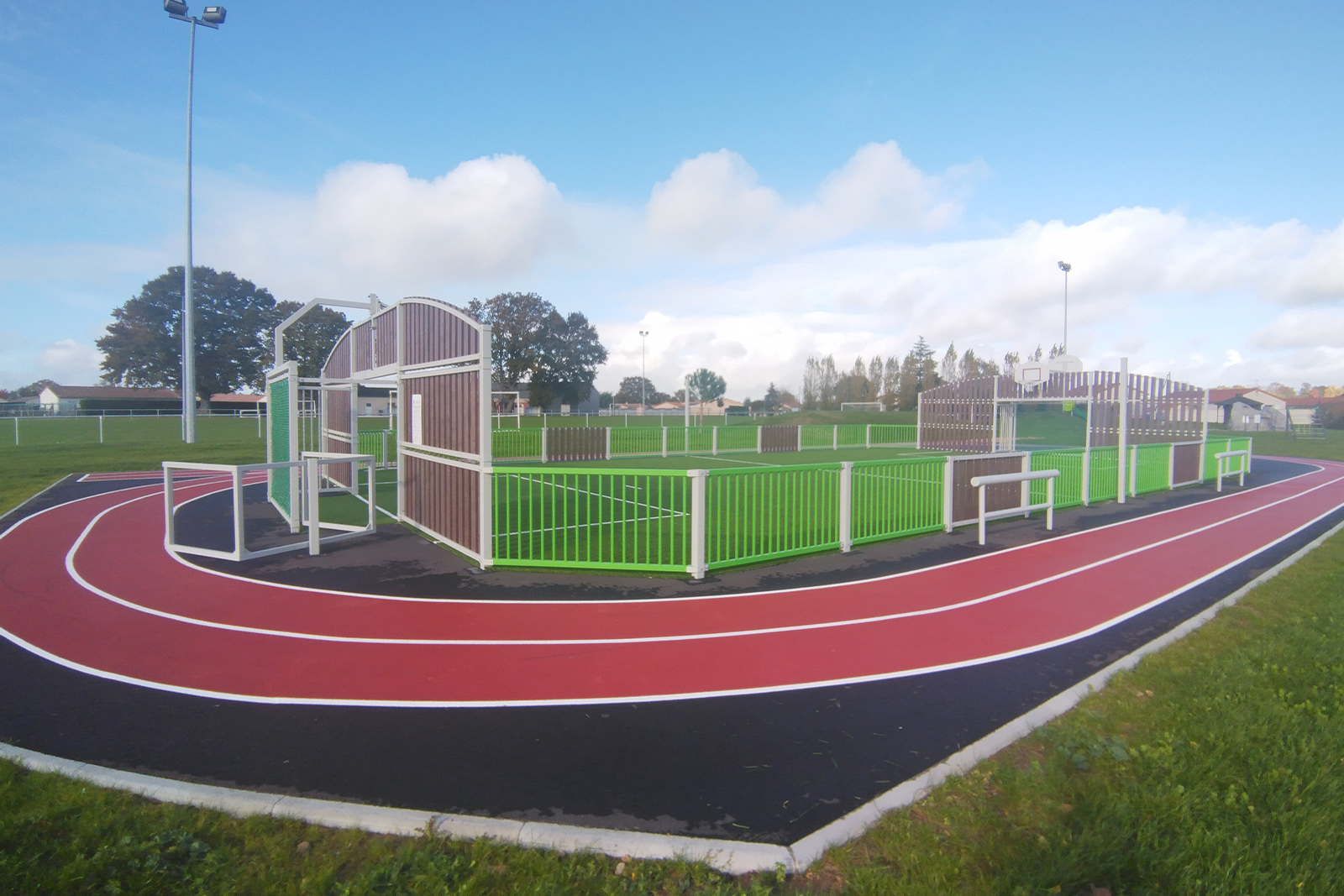 City stade : Multi disciplines sur gazon synthétique avec piste d’athlétisme et saut en longueur.